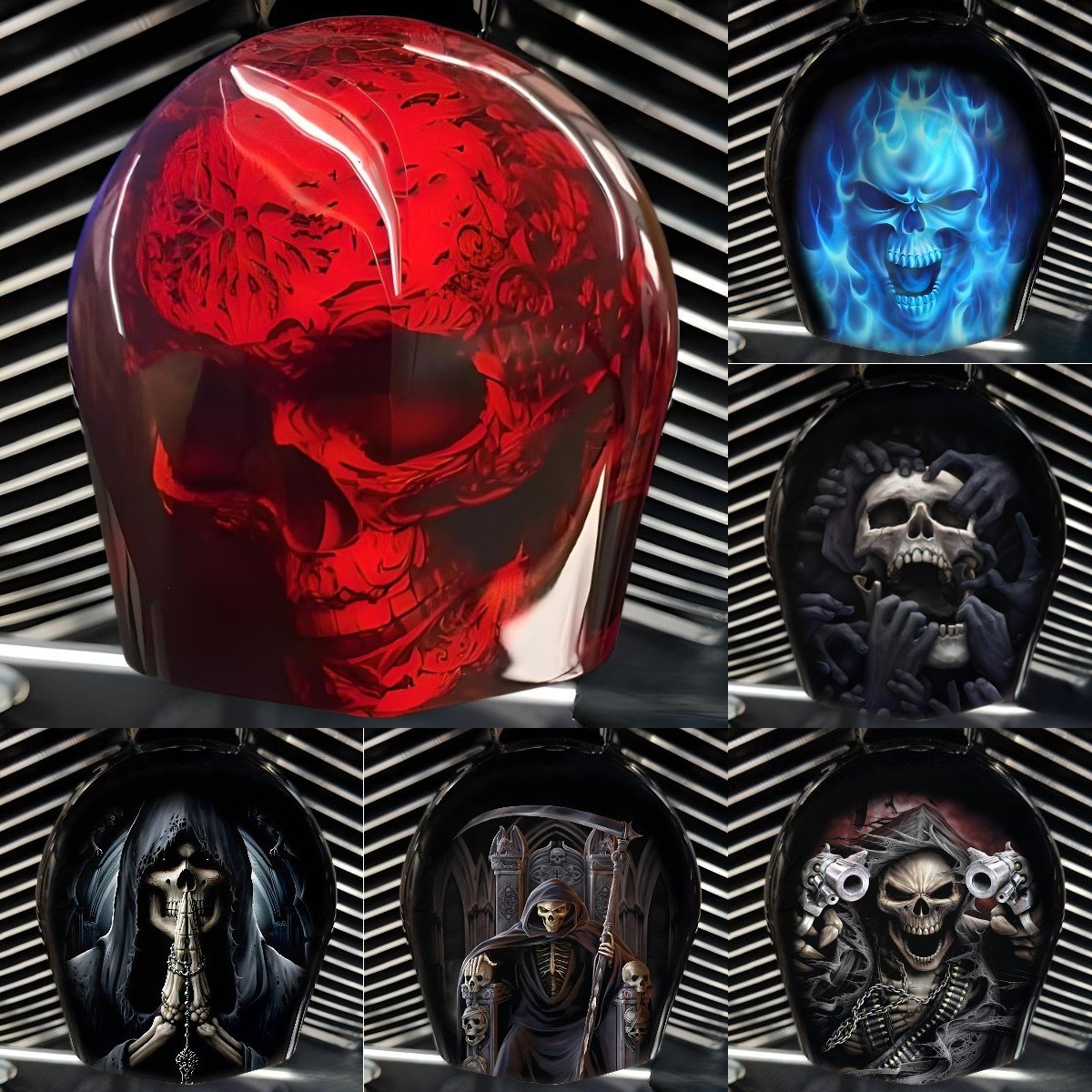 Replace your stock factory cowbell or waterfall style horn with this custom handmade piece, utilizing your existing hardware. The design is hardcoated onto the OEM horn cover, with the design fading to black on the sides to compliment the engine.